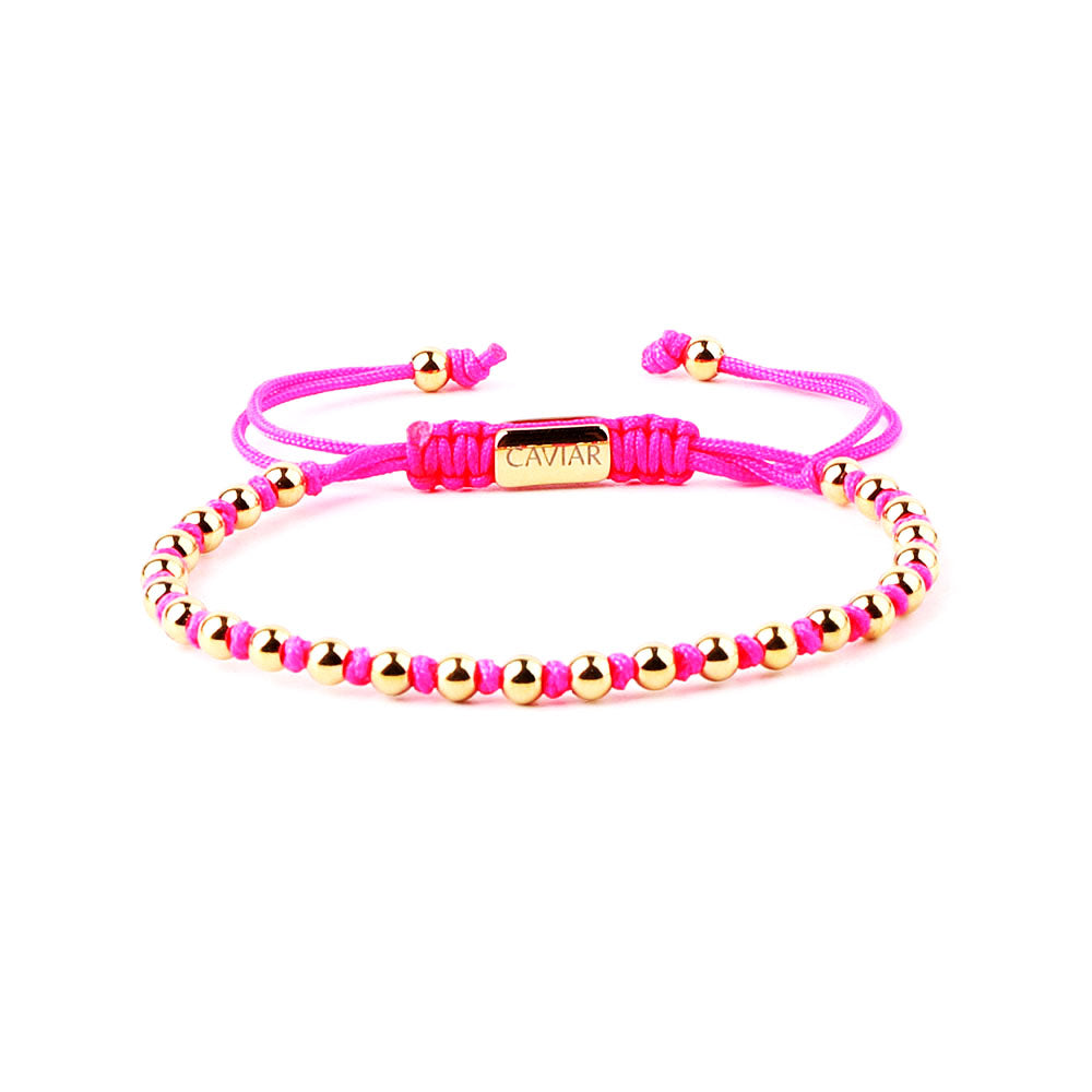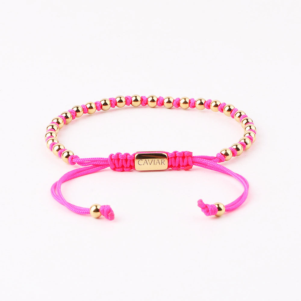 Onze kralenarmband is met de hand gemaakt van sterk nylon koord en afgewerkt met een verstelbaar trekkoordslot. De armband opent door de kralen die het dichtst bij het slotje liggen in tegengestelde richting te trekken en sluit door de kleine, bungelende gouden kralen in tegengestelde richting te trekken.