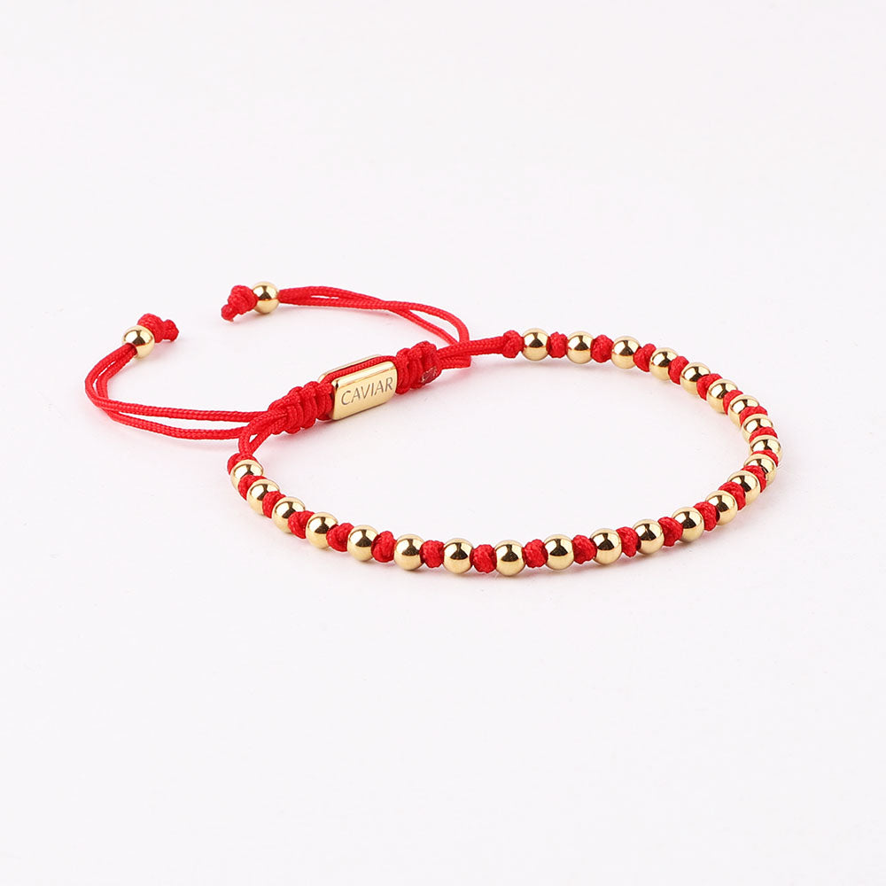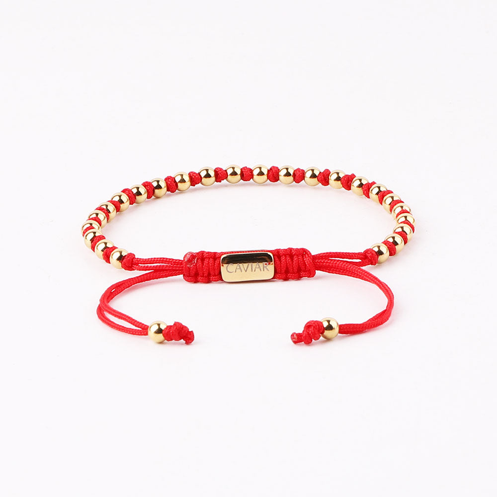 Onze kralenarmband is met de hand gemaakt van sterk nylon koord en afgewerkt met een verstelbaar trekkoordslot. De armband opent door de kralen die het dichtst bij het slotje liggen in tegengestelde richting te trekken en sluit door de kleine, bungelende gouden kralen in tegengestelde richting te trekken.