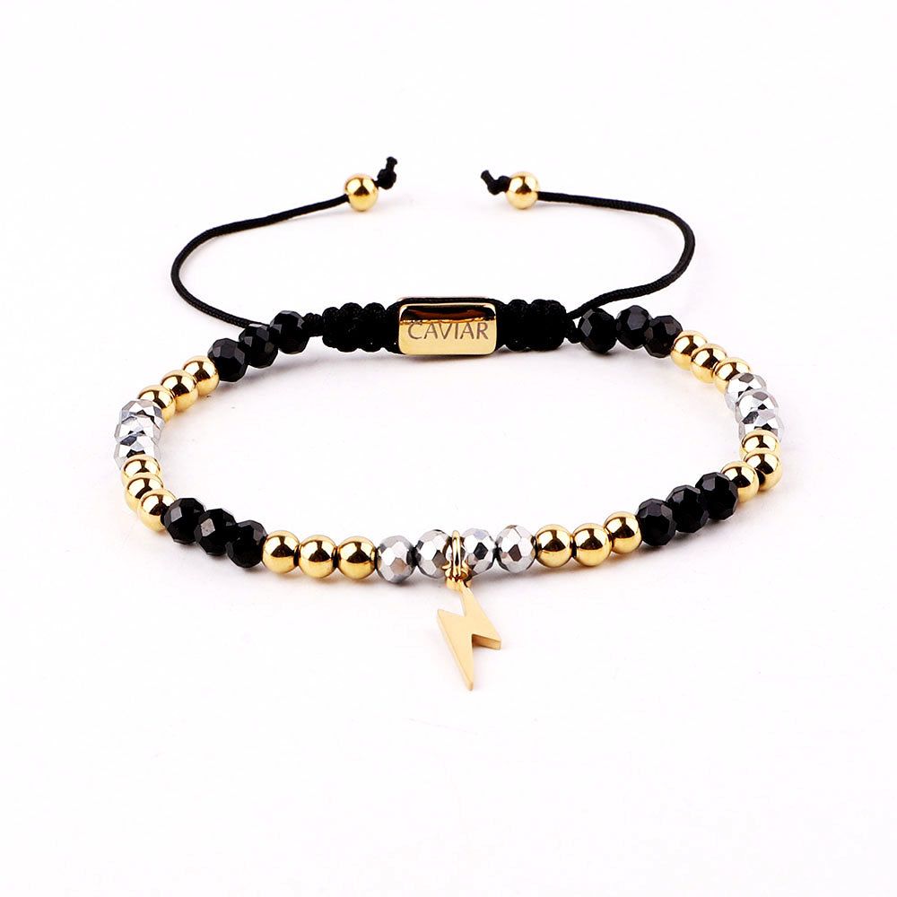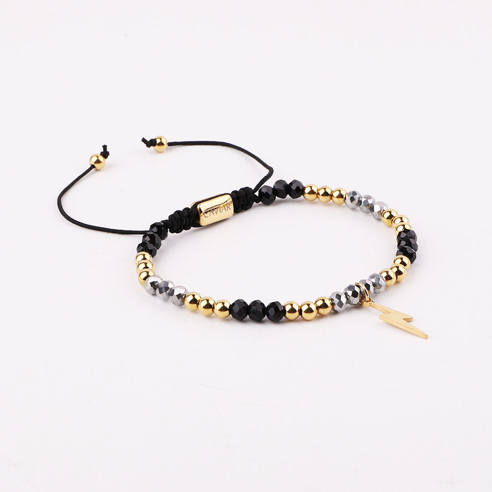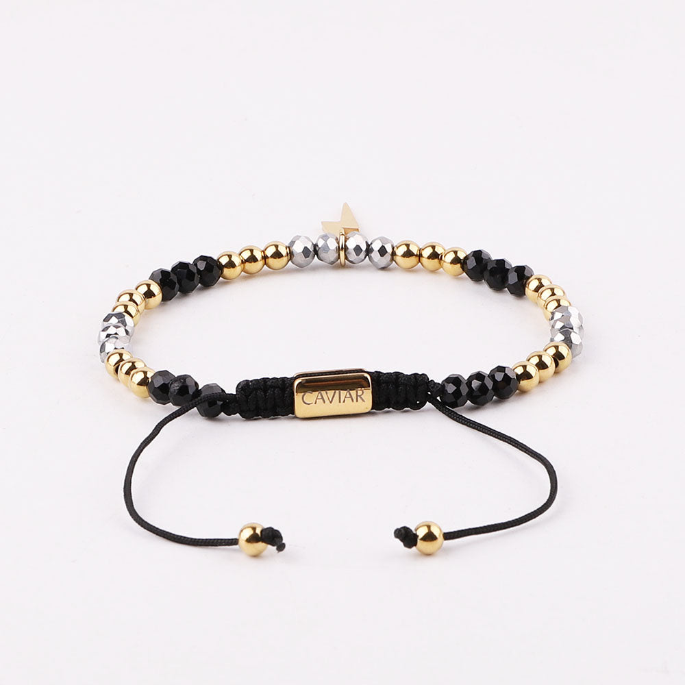 Onze kralenarmband is met de hand gemaakt van sterk nylon koord en afgewerkt met een verstelbaar trekkoordslot. De armband opent door de kralen die het dichtst bij het slotje liggen in tegengestelde richting te trekken en sluit door de kleine, bungelende gouden kralen in tegengestelde richting te trekken.