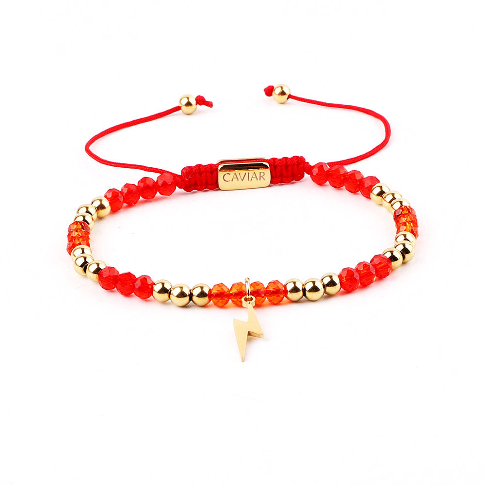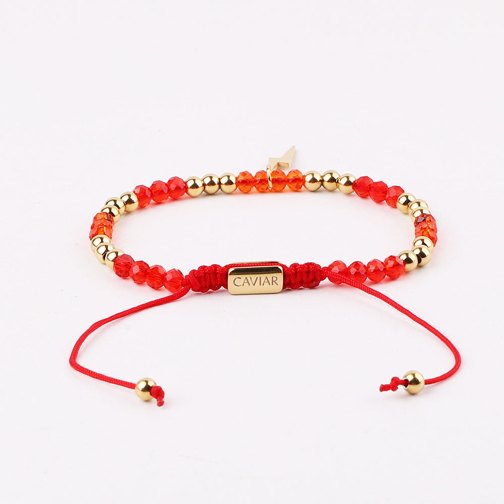 Onze kralenarmband is met de hand gemaakt van sterk nylon koord en afgewerkt met een verstelbaar trekkoordslot. De armband opent door de kralen die het dichtst bij het slotje liggen in tegengestelde richting te trekken en sluit door de kleine, bungelende gouden kralen in tegengestelde richting te trekken.