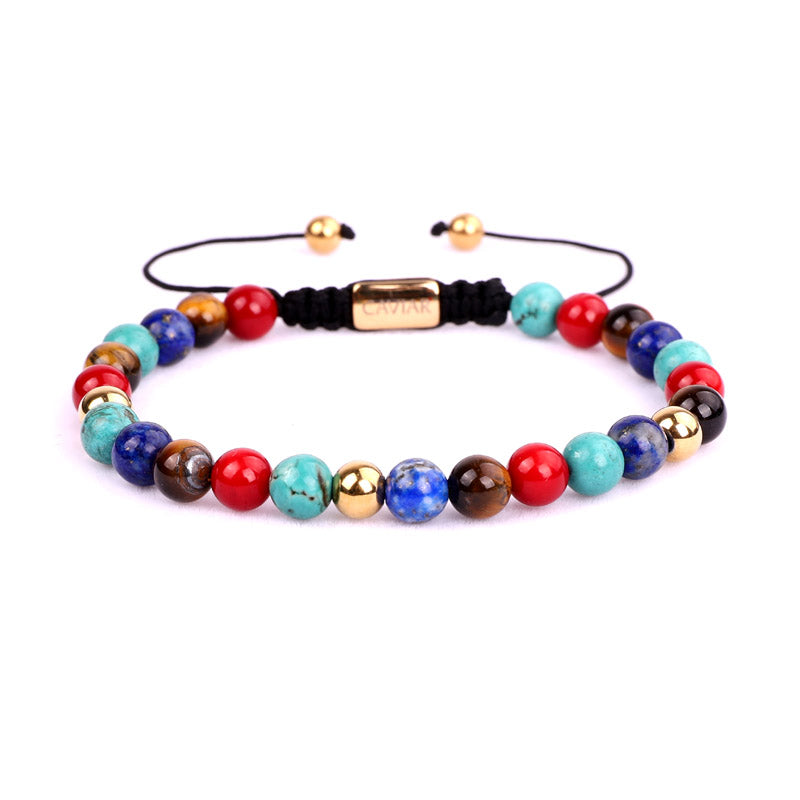Onze kralenarmband is met de hand gemaakt van sterk nylon koord en afgewerkt met een verstelbaar trekkoordslot. De armband opent door de kralen die het dichtst bij het slotje liggen in tegengestelde richting te trekken en sluit door de kleine, bungelende gouden kralen in tegengestelde richting te trekken.