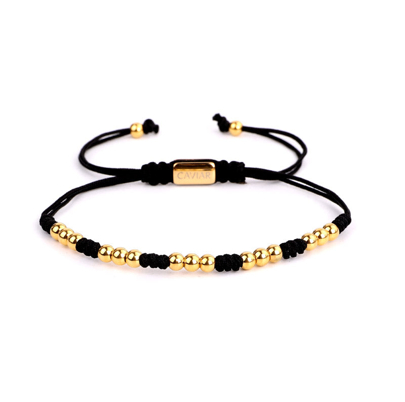 Onze kralenarmband is met de hand gemaakt van sterk nylon koord en afgewerkt met een verstelbaar trekkoordslot. De armband opent door de kralen die het dichtst bij het slotje liggen in tegengestelde richting te trekken en sluit door de kleine, bungelende gouden kralen in tegengestelde richting te trekken.