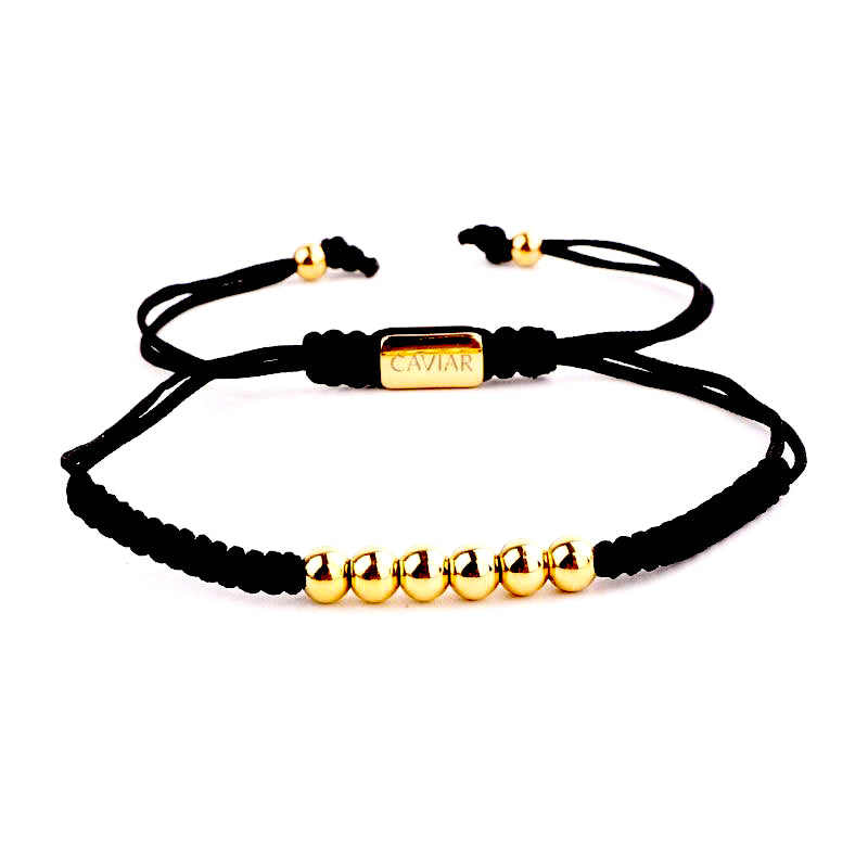 Onze kralenarmband is met de hand gemaakt van sterk nylon koord en afgewerkt met een verstelbaar trekkoordslot. De armband opent door de kralen die het dichtst bij het slotje liggen in tegengestelde richting te trekken en sluit door de kleine, bungelende gouden kralen in tegengestelde richting te trekken.