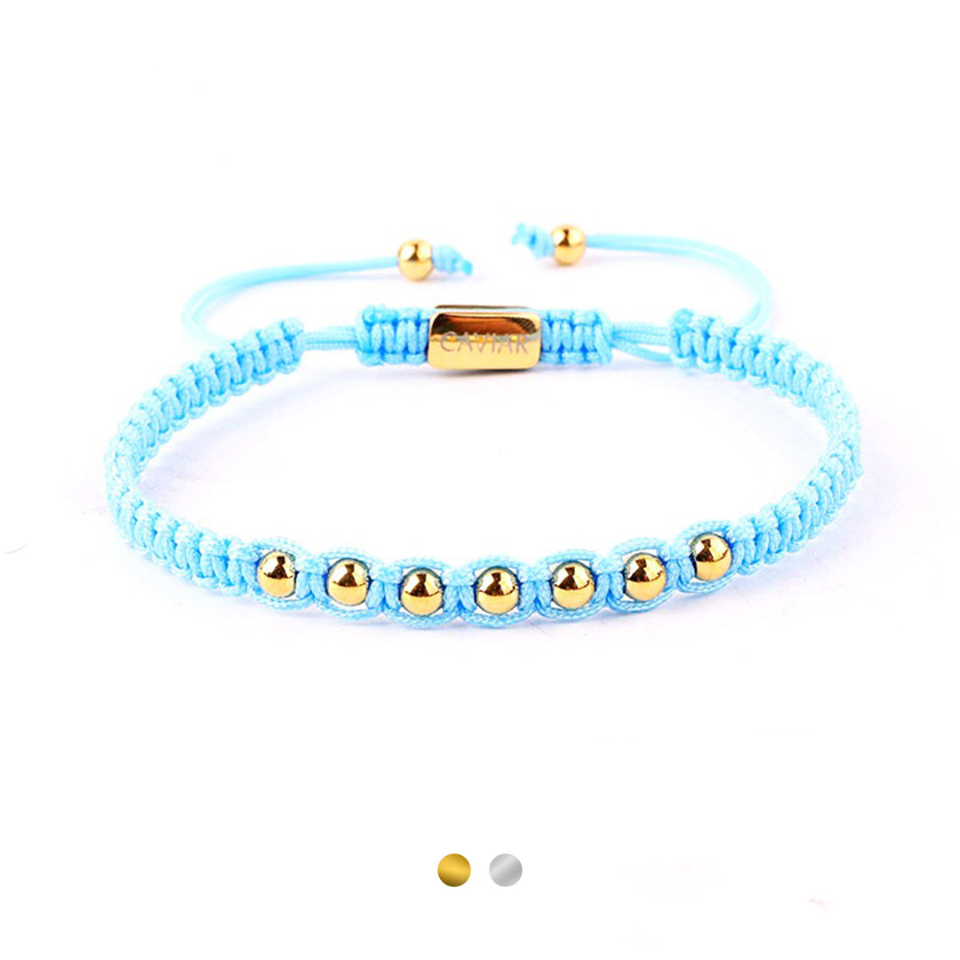 Onze kralenarmband is met de hand gemaakt van sterk nylon koord en afgewerkt met een verstelbaar trekkoordslot. De armband opent door de kralen die het dichtst bij het slotje liggen in tegengestelde richting te trekken en sluit door de kleine, bungelende gouden kralen in tegengestelde richting te trekken.