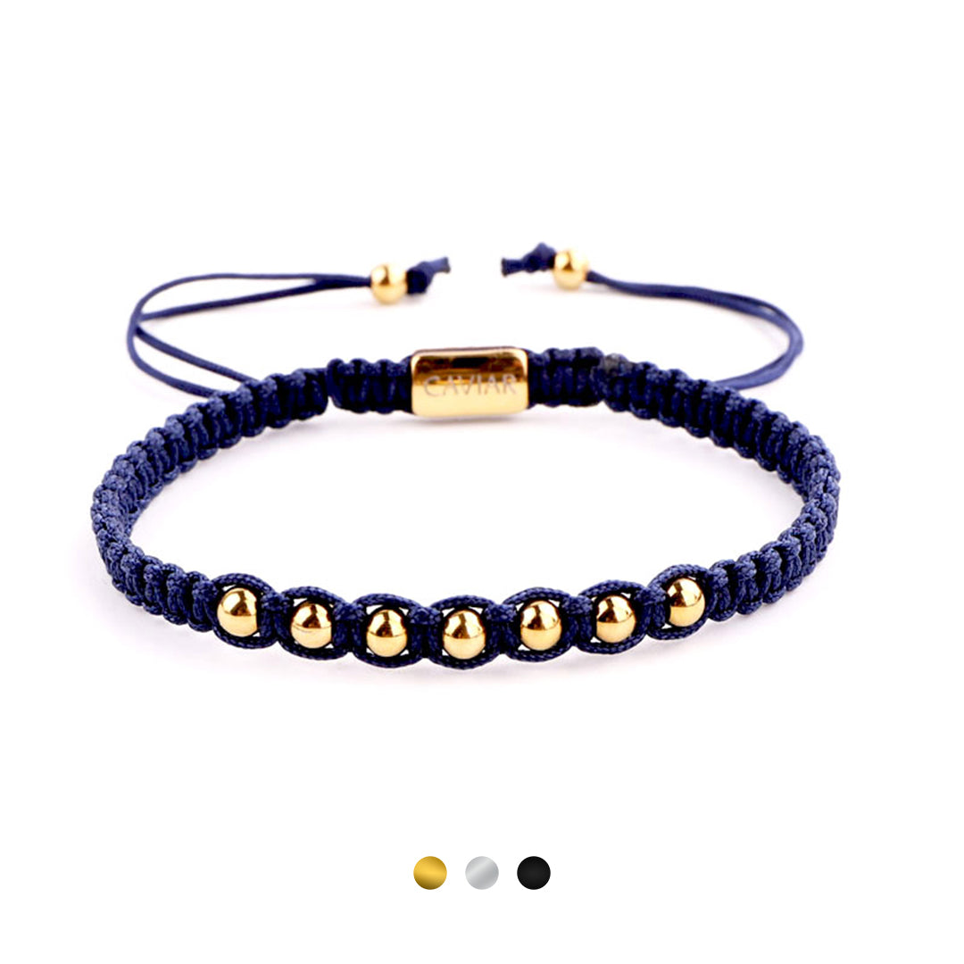 Onze kralenarmband is met de hand gemaakt van sterk nylon koord en afgewerkt met een verstelbaar trekkoordslot. De armband opent door de kralen die het dichtst bij het slotje liggen in tegengestelde richting te trekken en sluit door de kleine, bungelende gouden kralen in tegengestelde richting te trekken.