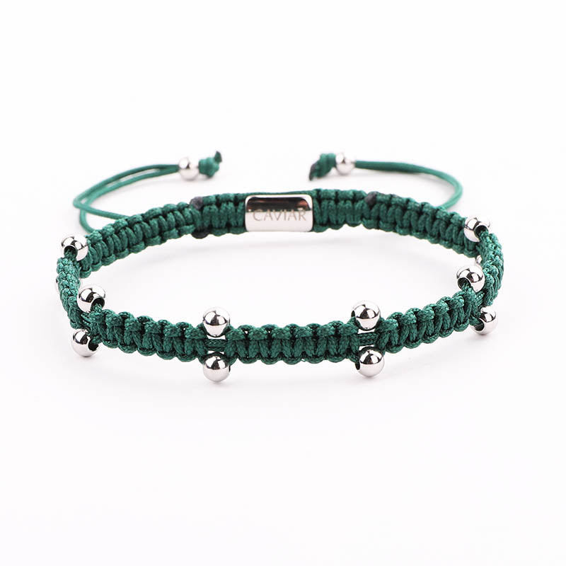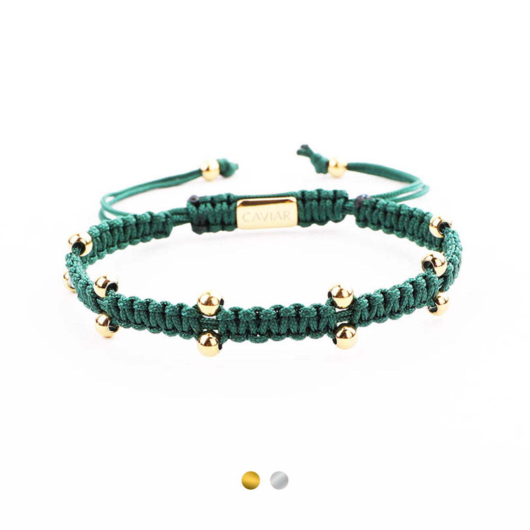 Onze kralenarmband is met de hand gemaakt van sterk nylon koord en afgewerkt met een verstelbaar trekkoordslot. De armband opent door de kralen die het dichtst bij het slotje liggen in tegengestelde richting te trekken en sluit door de kleine, bungelende gouden kralen in tegengestelde richting te trekken.