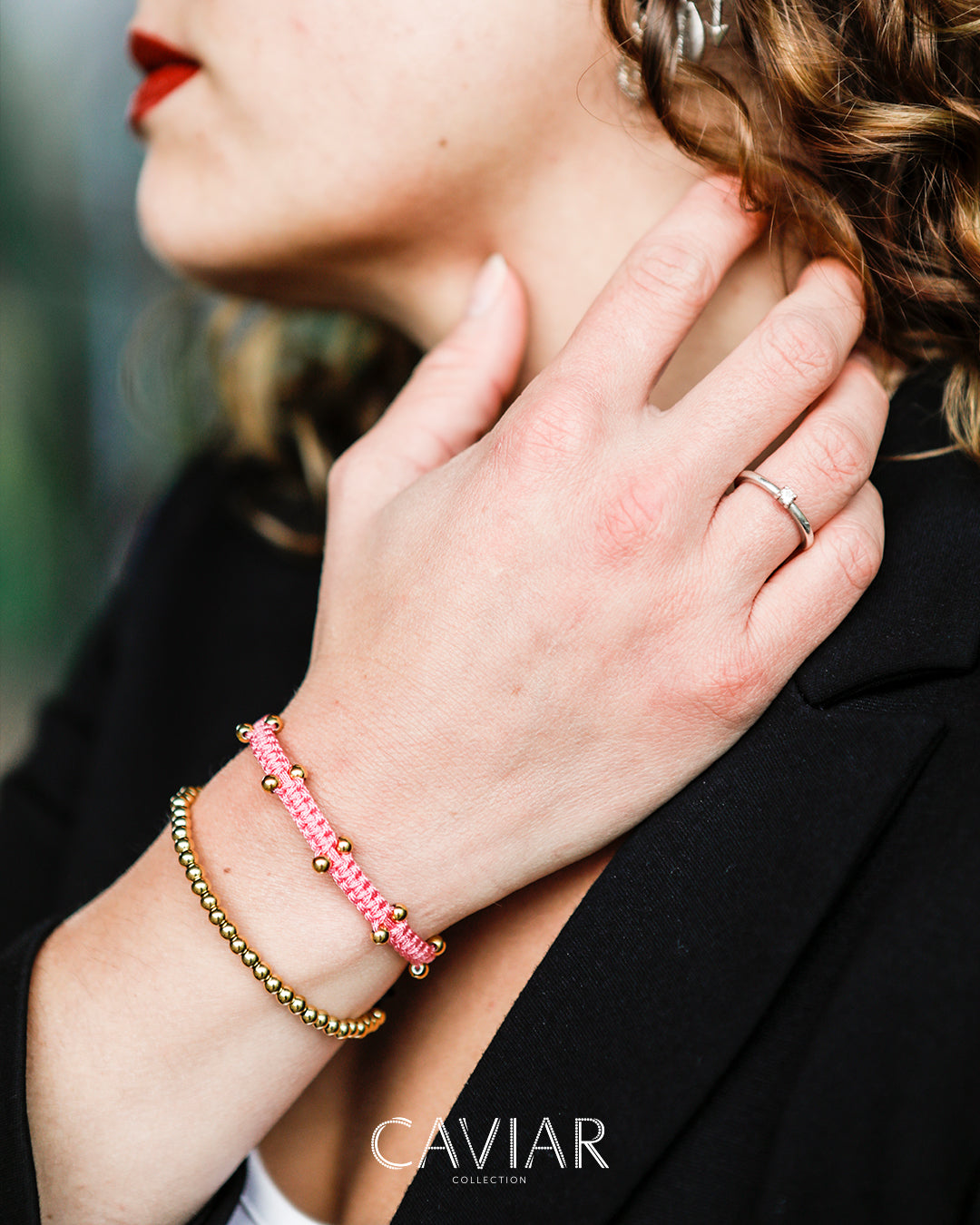 Onze kralenarmband is met de hand gemaakt van sterk nylon koord en afgewerkt met een verstelbaar trekkoordslot. De armband opent door de kralen die het dichtst bij het slotje liggen in tegengestelde richting te trekken en sluit door de kleine, bungelende gouden kralen in tegengestelde richting te trekken.