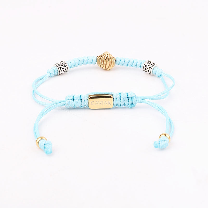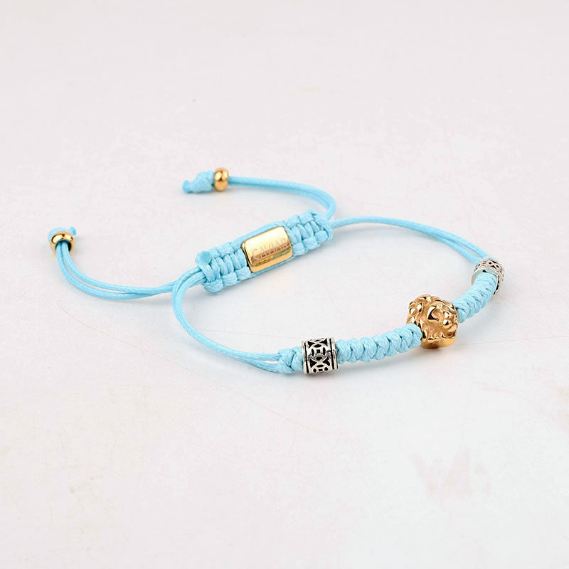 Deze armband is met de hand gemaakt van sterk nylon koord en afgewerkt met een verstelbaar trekkoordslot. De armband opent door de koord die het dichtst bij het slotje ligt in tegengestelde richting te trekken en sluit door de kleine, bungelende gouden kralen in tegengestelde richting te trekken.
