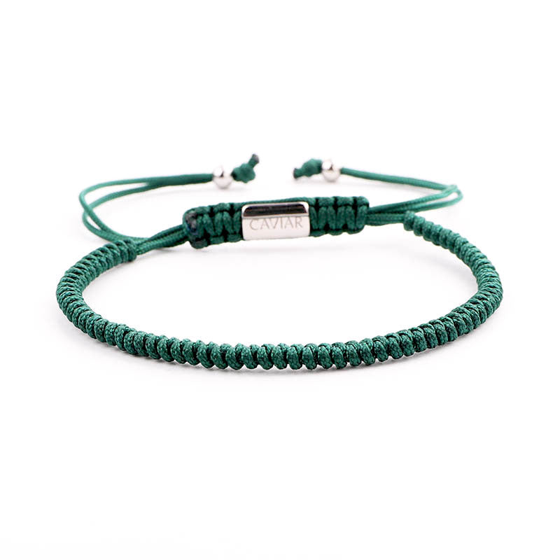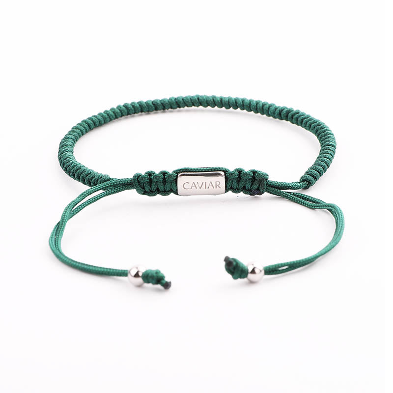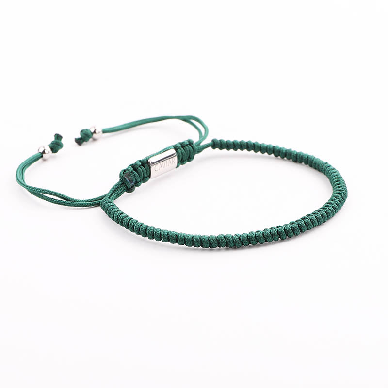 Deze armband is met de hand gemaakt van sterk nylon koord en afgewerkt met een verstelbaar trekkoordslot. De armband opent door de koord die het dichtst bij het slotje ligt in tegengestelde richting te trekken en sluit door de kleine, bungelende zilveren kralen in tegengestelde richting te trekken.