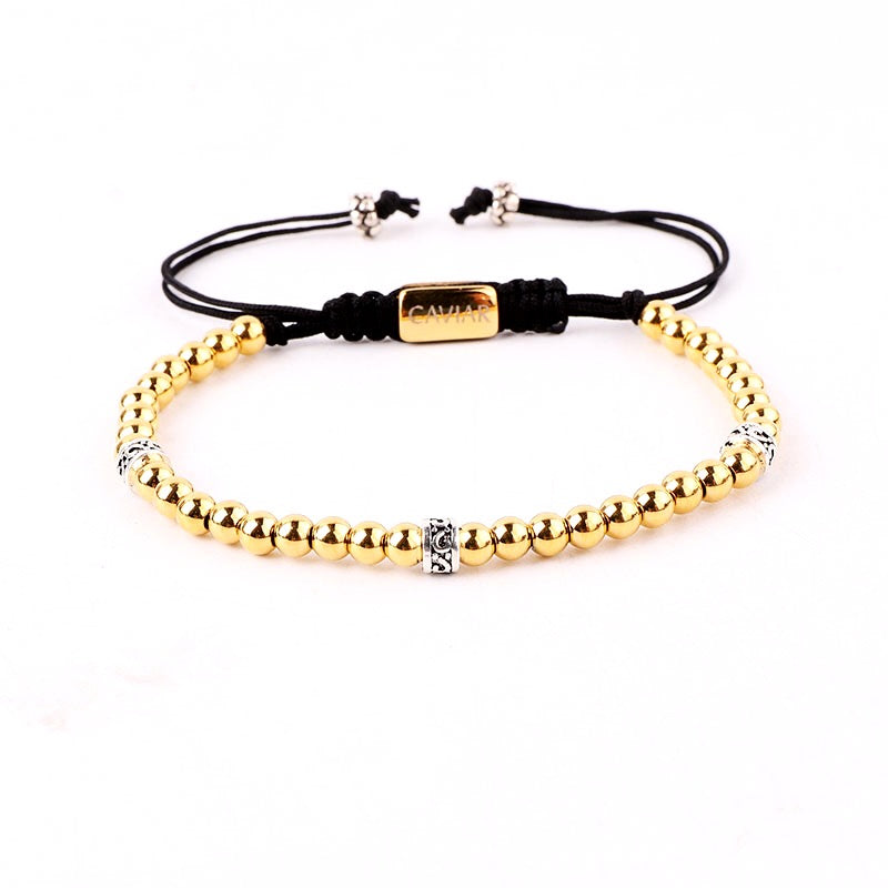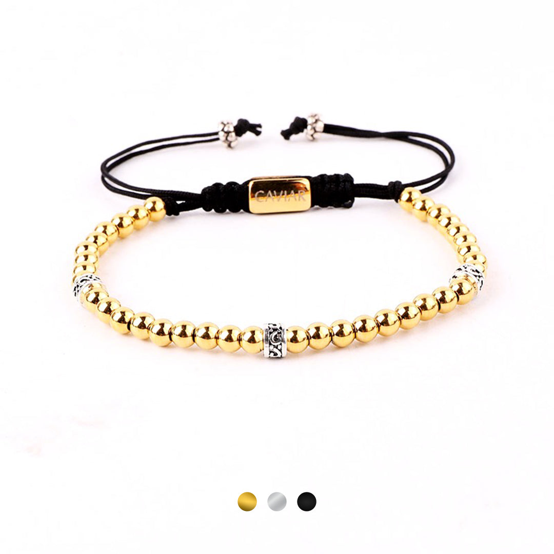 Onze kralenarmband is met de hand gemaakt van sterk nylon koord en afgewerkt met een verstelbaar trekkoordslot. De armband opent door de kralen die het dichtst bij het slotje liggen in tegengestelde richting te trekken en sluit door de kleine, bungelende gouden kralen in tegengestelde richting te trekken.