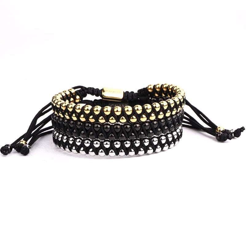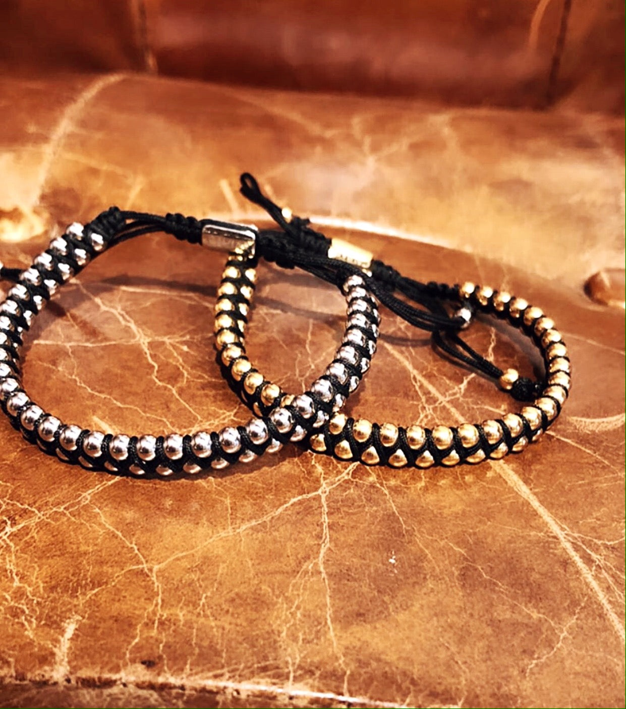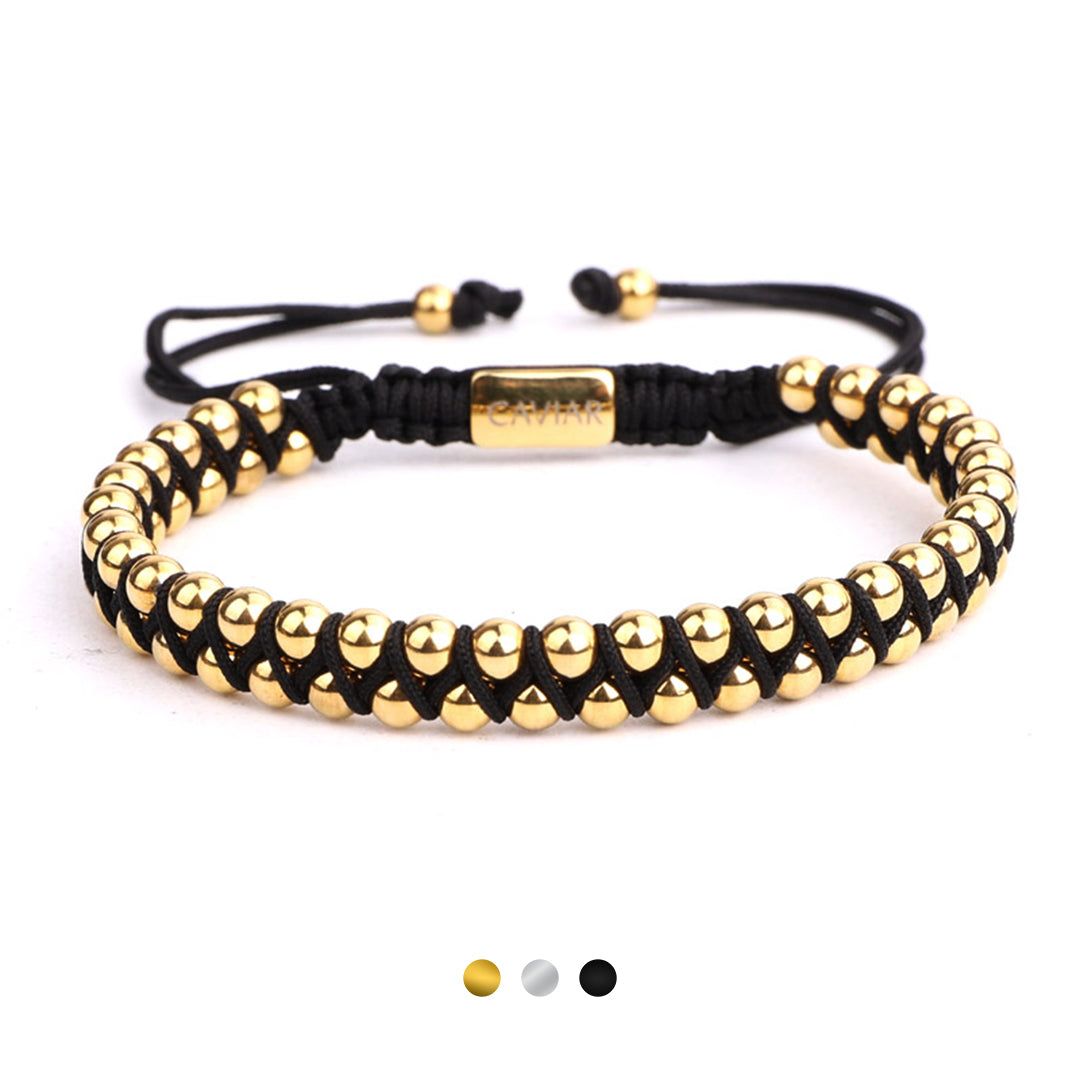 Onze kralenarmband is met de hand gemaakt van sterk nylon koord en afgewerkt met een verstelbaar trekkoordslot. De armband opent door de kralen die het dichtst bij het slotje liggen in tegengestelde richting te trekken en sluit door de kleine, bungelende gouden kralen in tegengestelde richting te trekken.